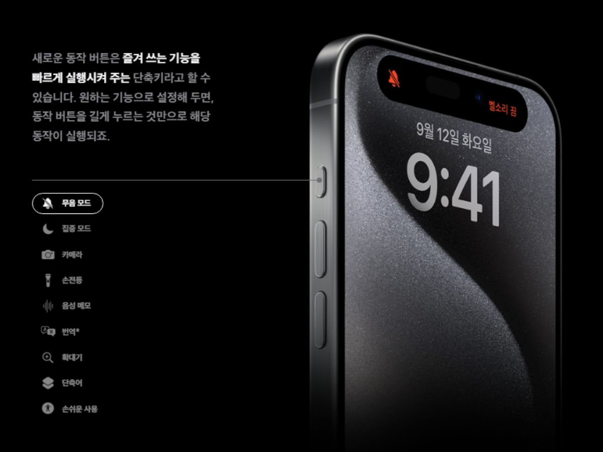 그리고 프로 라인의 경우는 기존에 음소거 버튼으로 쓰이던 부분을 '액션 버튼'으로 개조하면서 맞춤형 기능을 설정할 수 있게 되었는데요.